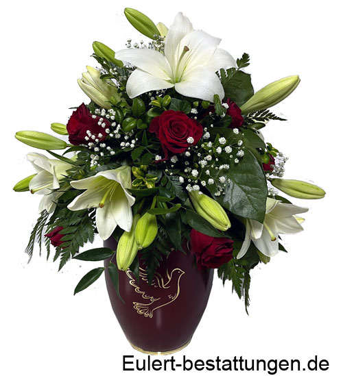 Urnenkranz für eine Urnen Bestattung im Panketal am 23.11.2022 mit roten Rosen und weißen Lilien.